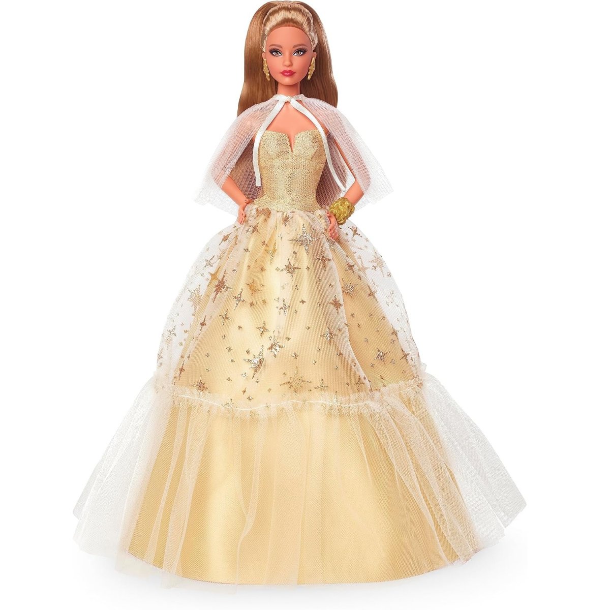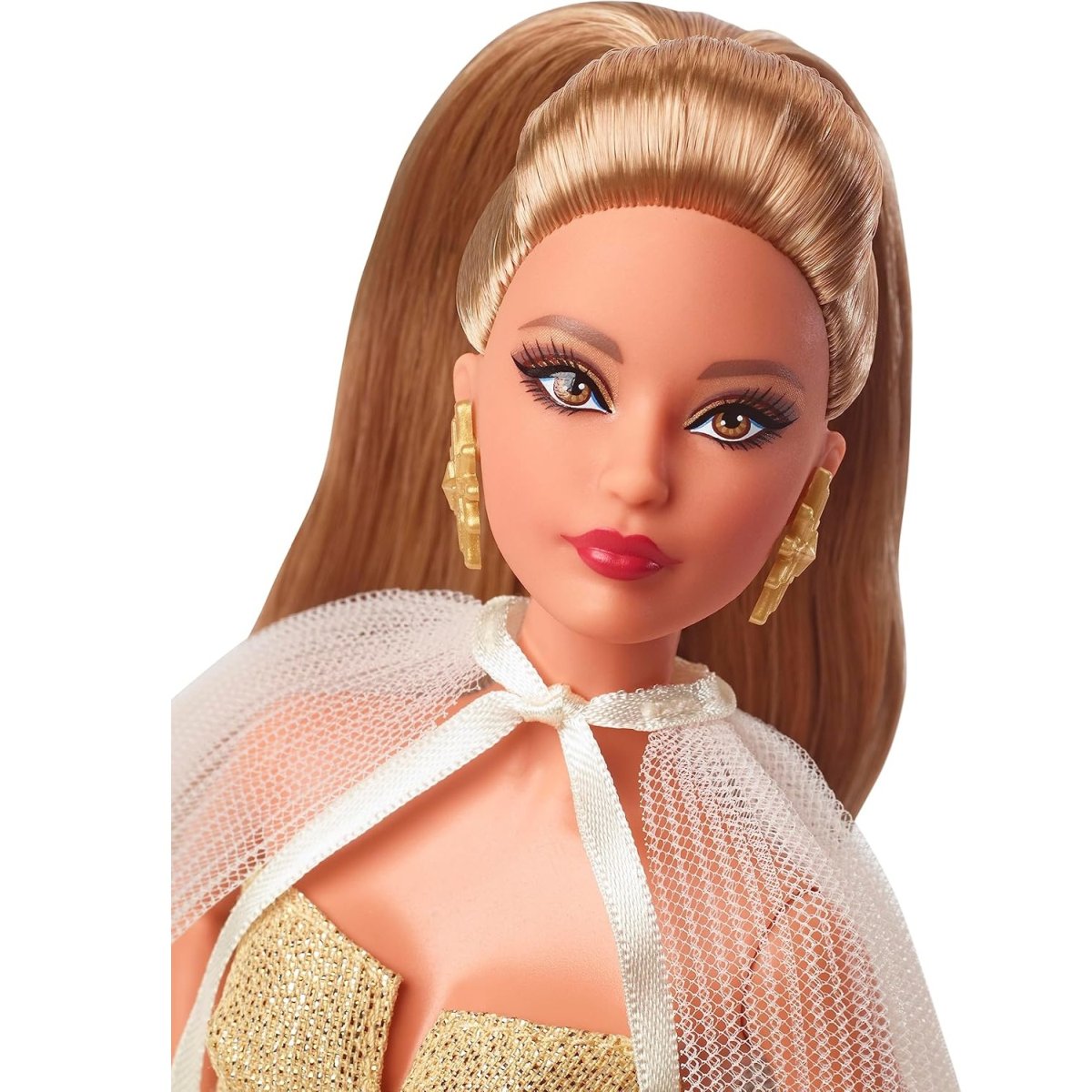 Pileli şeffaf pelerin fildişi saten bir kurdeleyle boyundan bağlanırken gösterişli altın küpeler ve işlemeli altın bileklik mevsimin ışıltısını yakalar